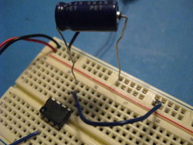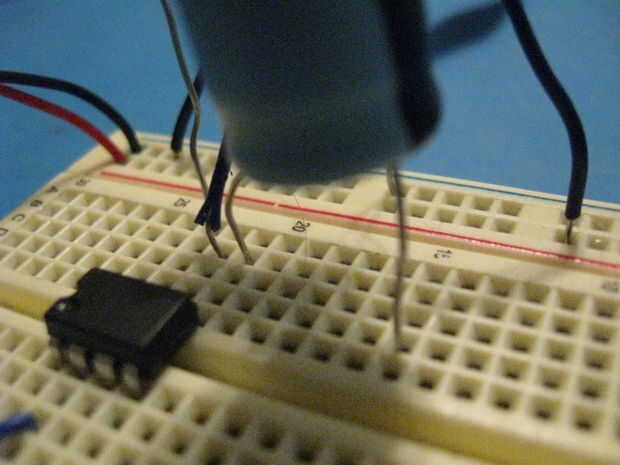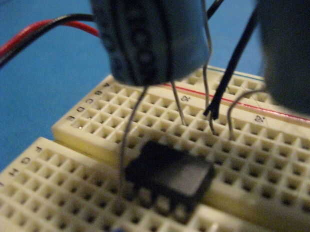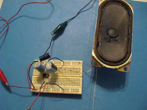 3. Conecte el lado positivo de su condensador de 100 μF en ping 7 y el lado negativo en tierra. Conecte un lado positivo de su condensador de 1000 μF pin 1 y el lado negativo en el pin 8. Lado positivo de los otros 1000 μF condensador pin 5 y el lado negativo en un espacio en blanco en su tabla. Conecte el lado positivo del altavoz al lado negativo del condensador pasado y el lado negativo de su altavoz a la tierra.
