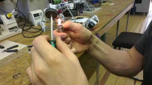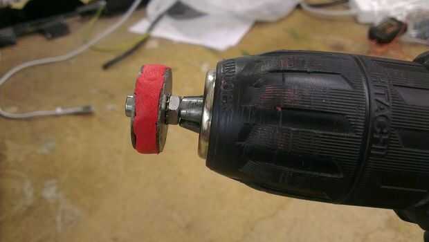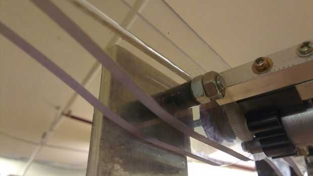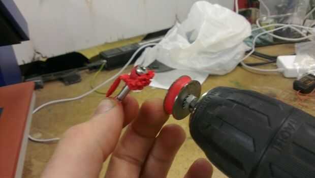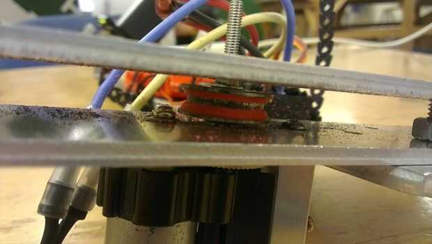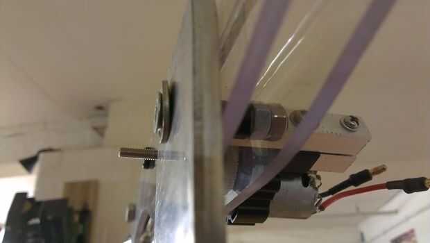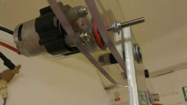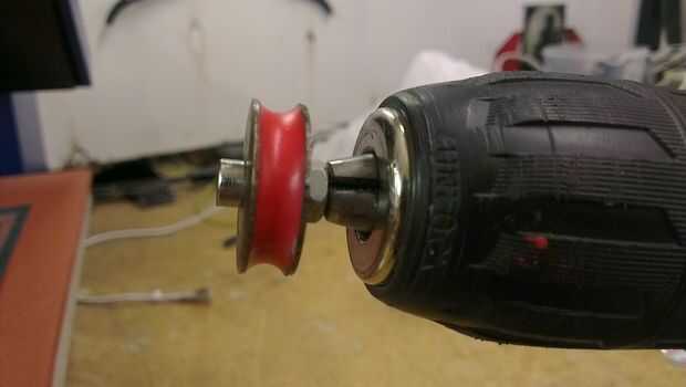Falta cinco: Paracord. Una rueda de polea de metal desnudo para coche funcionó bien en tendedero de PVC, pero resbaló en paracord, quema en el proceso. Intento con termo retráctil (fotografiado), pero era demasiado desigual. Intentó otro fix con Sugru, pero el paracord en segundos cuando el motor se acelera justo llevaba a través de él.