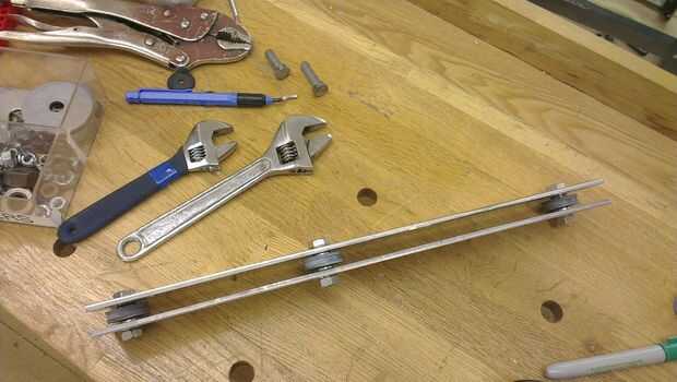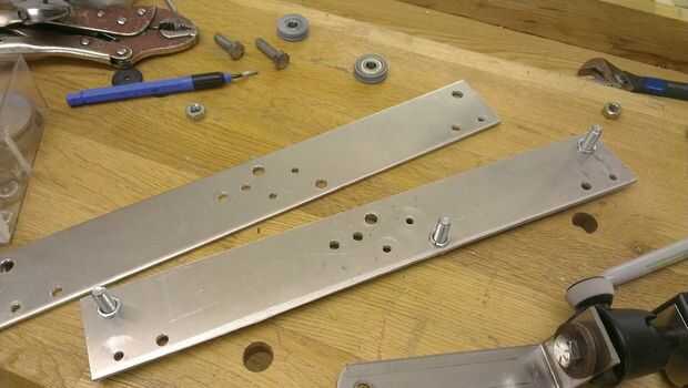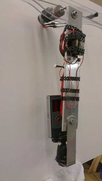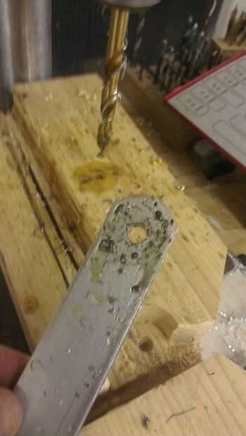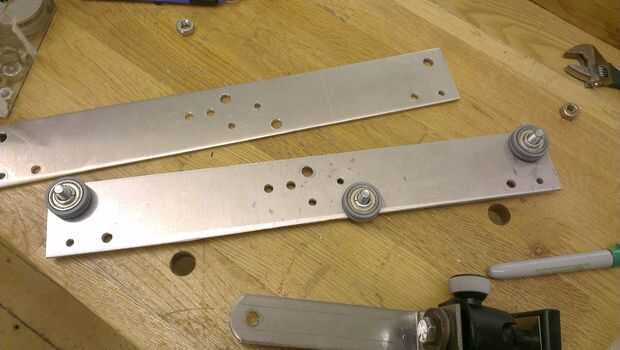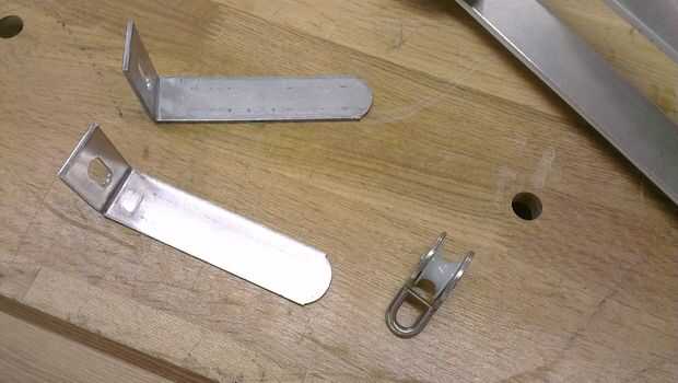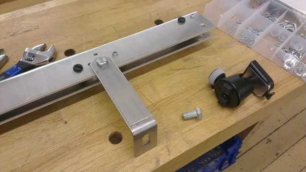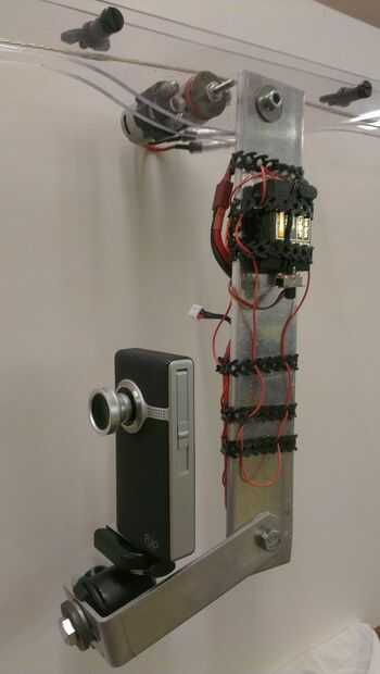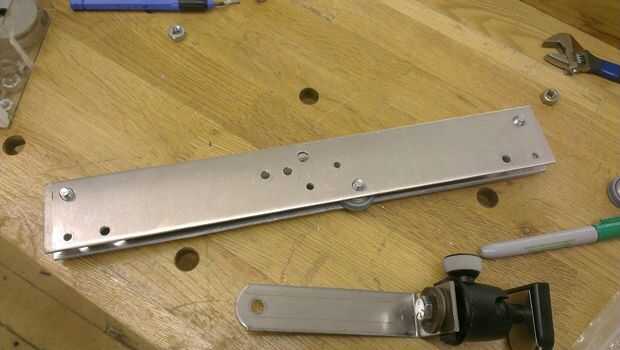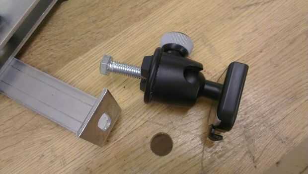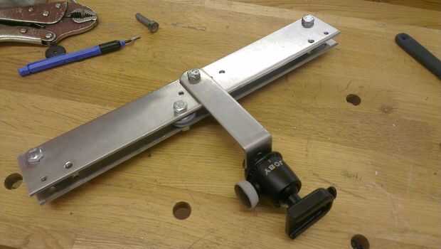 Probé un gancho corto en primer lugar, resultaba demasiado inestable, añadió sobre un pie de la tira de aluminio, creando una notable mejora en el rendimiento. Junto con la cabeza del trípode, esto también tenía la ventaja de hacer la posición de la cámara más ajustable.