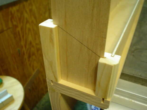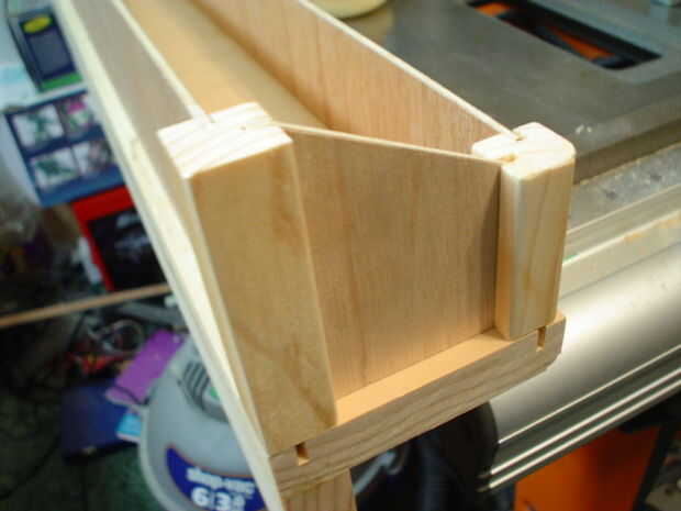 Ahora mide entre los ángulos anterior y posterior, dentro de las ranuras y cortar una pequeña tira de luan para deslizar en las ranuras. Deslice la tira, y luego utilizando una regla dibuje una línea desde la parte trasera a las esquinas delanteras para hacer un ángulo. Usando la guía y algunos restos de madera como guía Alinee la marca de había hecho y establecer el calibre de ingletes para que coincida con el ángulo. Quite el rip valla y desecho de la madera y corte a lo largo de la línea que se hizo utilizando el calibre de ingletes. Restablecer el calibrador de inglete a 0 grados cuadrados y corte una pieza duplicada, vuelva a usar el ángulo que acaba cuando usted corta la última pieza. Lije las piezas y deslizarlas en su lugar para probar el ajuste. Una vez que estés satisfecho con el ajuste encolarlas. Una vez asegurado el uso un lijado bloque para suavizar la protuberancia por encima de los pedazos de la esquina posterior.