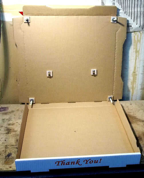 De la parte superior de la tapa de la caja de pizza, inserte un tornillo de máquina de nylon, con una arandela de nylon, a través de cada uno de los cuatro orificios. [El metal en los pernos de acero interferiría con la bobina, por lo que el nylon que se utilizan en su lugar y arandelas de nylon se utilizan en la parte superior de la tapa para ayudar a mantener la apariencia de la caja blanca.]