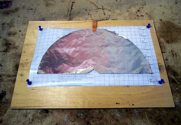 Cortar un trozo de papel de aluminio resistente 6" por 12". Utilice uno de los discos de cartón como guía para trazar un semicírculo sobre el papel. Cuidadosamente corte el papel a lo largo de la línea rastreada. En el centro del borde recto en la parte inferior del círculo la mitad, cortar un pequeño triángulo de papel de aluminio con sobre un ½" ápice apuntando hacia arriba en la parte superior del arco. Quitando esta pequeña sección hará que ninguna hoja entra en contacto con el perno de centro. De lo contrario, el condensador variable puede estar en corto circuito hacia fuera.