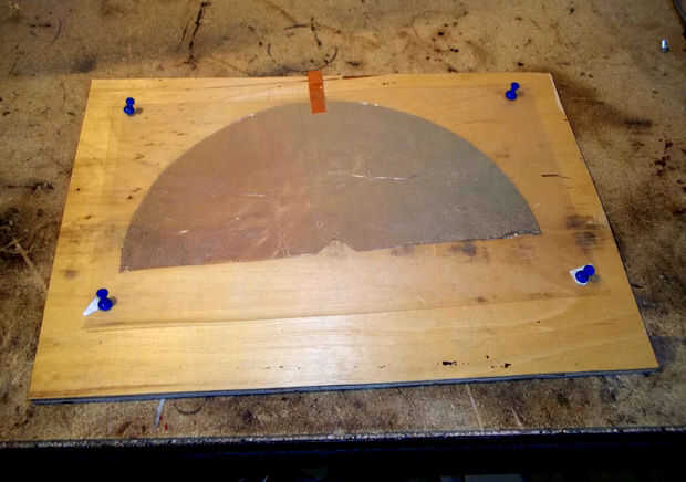 Si usted no toma el atajo se describe en el párrafo anterior, entonces el siguiente paso es cortar dos piezas idénticas de papel adhesivo estante un poco más grande que 6" por 12" (8" por 14" debe hacerlo). El medio círculo de aluminio se encuentra entre estos dos. Retire el papel en uno y coloque la hoja de modo que hay un pequeño plástico extra todo el camino alrededor de los bordes de la hoja. Virar hacia un tablero de ayuda, como quitar un poco respaldo a la vez.