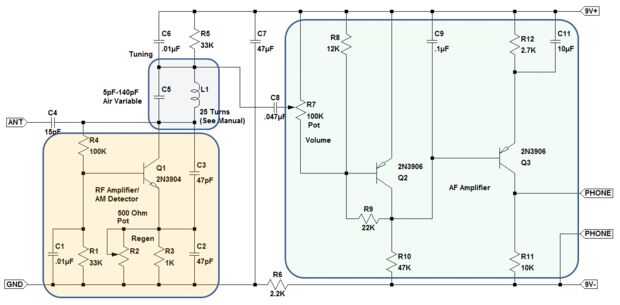 El amplificador de RF / AM sección Detector es realmente un oscilador Colpitts con una agregado resistencia variable R2 que sirve como el control de regeneración. Resistencias R1 y R4 proporcionan voltaje de base a Q1 que es coleccionista se fija en aproximadamente 3V. Esta tensión de colector fue elegida para que el amplificador de RF / AM Detector seguirá funcionando correctamente como la batería de 9V llega al final de su vida. Los grandes valores de R1 y R4 y la configuración del sesgada arranque están conectados, fueron elegidos para que el amplificador de RF / AM Detector tendrá una alta impedancia de entrada que mejora la selectividad y la sensibilidad de la radio. Los condensadores C1 y C6 se incluyeron para omitir RF alrededor de resistencias R1 y R5, respectivamente que mejora la ganancia del circuito amplificador de RF. La salida del colector de Q1 se alimenta hacia el emisor de Q1 a través de los condensadores C2 y C3. Normalmente esta retroalimentación positiva haría que el amplificador de RF / AM Detector a oscilar continuamente. Sin embargo el control de la regeneración proporciona una cantidad ajustable de retroalimentación negativa en el emisor de Q1 que contrarresta la respuesta positiva. Ajustando cuidadosamente la cantidad de retroalimentación negativa en el emisor de Q1, el circuito se puede hacer para proporcionar ganancia extremadamente alta justo antes de oscilación se produce y al mismo tiempo eliminar la mayor parte de la señal portadora de RF y la imagen no deseada de la señal de audio. Este comportamiento es la razón la radio regenerativa funciona tan bien.