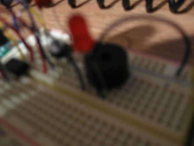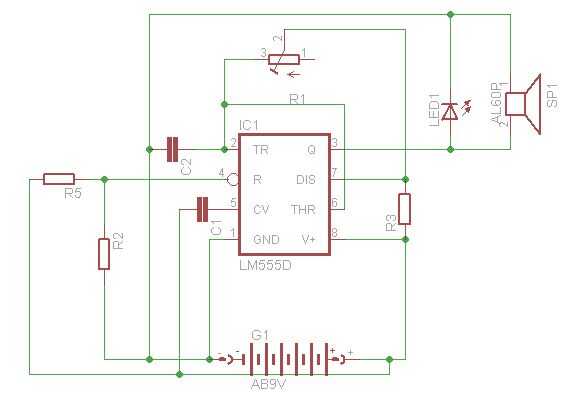 Finalmente Conecte el altavoz y el LED al pin 3 del chip 555 temporizador por medio de cables de puente y conecte los dos bornes negativos a tierra.