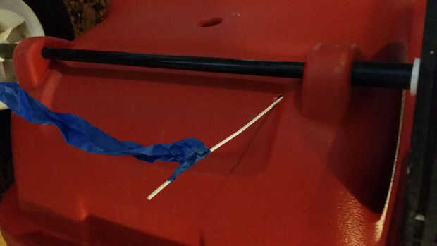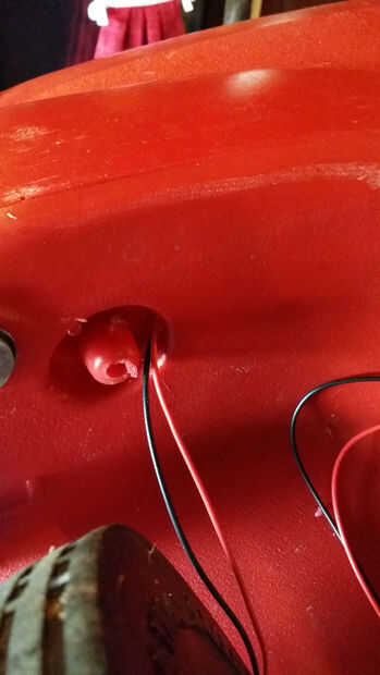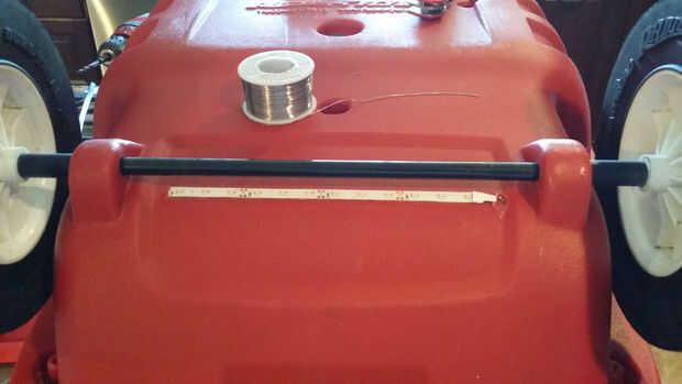 Taladré los agujeros para los cables en la parte trasera de la carreta y la parte delantera de la rueda. Usé el gancho de metal como guía y corrió desde atrás hacia delante (esto probablemente tuvo 30 minutos con una persona). Después de la suspensión le salió por el frente, grabó los cables a la suspensión y se tira de ellas a través de la parte posterior al frente.