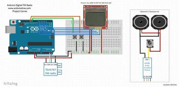 LM386 puede ser encendido por 5V ~ 12V (en el esquema puede encontrar pin 'rojo' con la etiqueta de 5V Vcc) más potencia significa más volumen. Usted puede ajustar 'ruido' de resistencia variable de 10K a bordo.