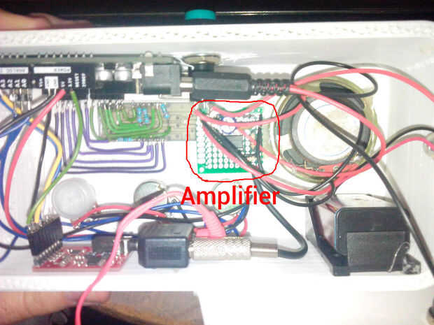 El amplificador del palillo en la pared de la caja y lo mismo con el altavoz. (Ver última imagen). Y conecte al conector de audio el conector doble.