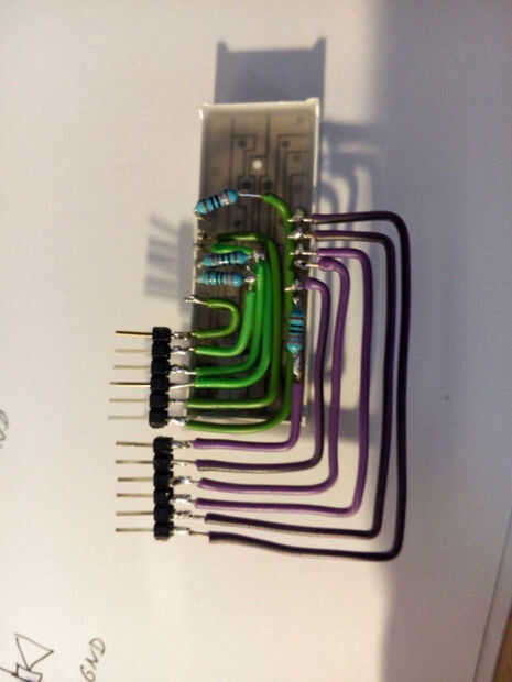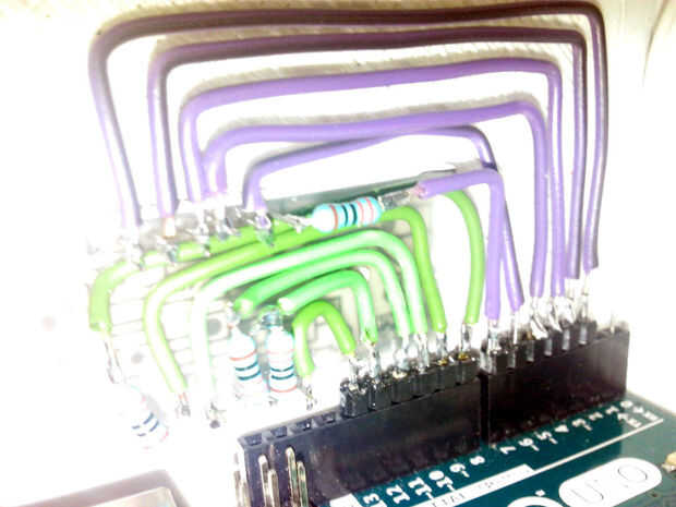 Antes de eso debemos soldar los alambres y los pinheaders a los alfileres de la pantalla y resistencias de 330 ohmios en los alfileres de dígitos. Como se puede ver en la imagen inferior. Los alambres verdes son las patillas superiores de la pantalla, hay una resistencia para cada dígitos pin D1, D2 y D3. Los cables de color púrpura son los pernos inferiores de la pantalla, en este caso sólo necesitamos un resistor. No te olvides de mirar la imagen de la pantalla o una hoja de datos para conseguir claro dónde está cada segmento un digitos.