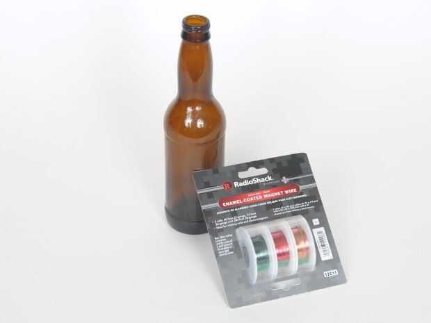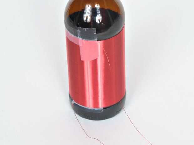 Cuando una bobina de la bobina, es intuitivo al viento "de la mano sobre la botella," pero esto introduce un giro en el cable, algo que no queremos. Una mejor manera de enrollar una bobina de giro menos es poner el carrete de hilo en algún tipo de eje y girar la botella lentamente. Comience pegando hacia abajo el extremo libre con cinta (inicio en la parte inferior de la botella, dejando unos 6" del cable para conectar más adelante).