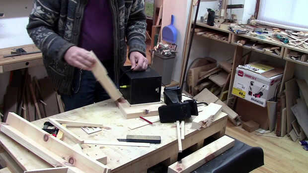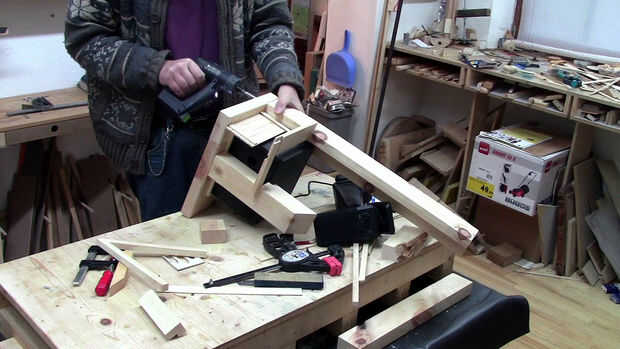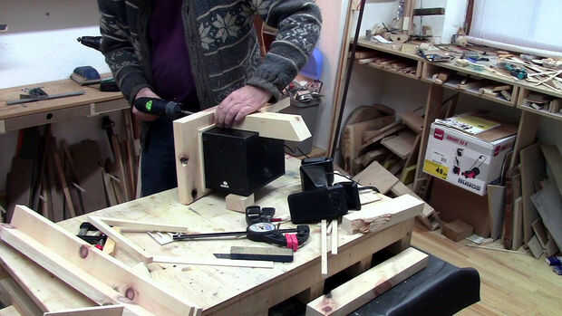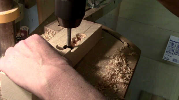 Perforé algunos agujeros en una pieza de madera para hacer un canal para el cable del altavoz de subgraves.