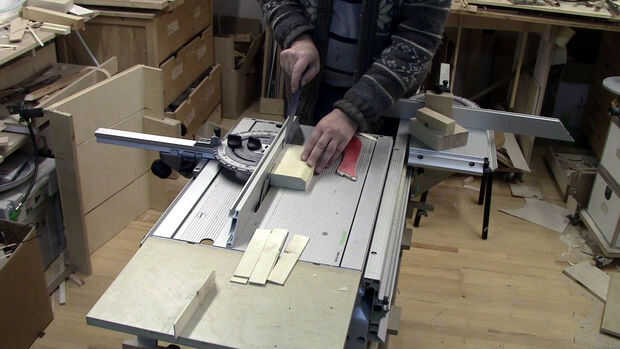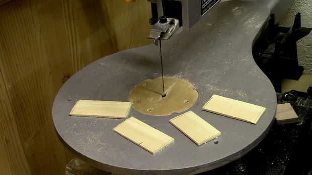 Para las paredes, corté muchas piezas finas en la Sierra de mesa.