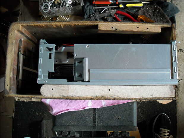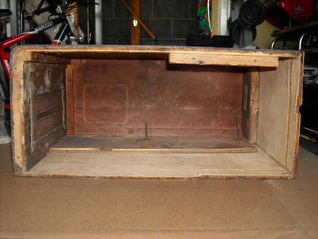Empty radio case. Mientras que prueba cómo el chasis del equipo vacío se ajustan en el caso de radio vacía, se dio cuenta de un montaje más sólido fue requerido para el chasis del equipo para montaje en y para la parte inferior de la radio montar, así que pegué un trozo de madera en el caso de la radio para montar el equipo y mantenerlo estable. El metal original del equipo fue cubierta fue reducida a ser utilizado para crear el interruptor y la luz panel. Ver cómo el chasis del equipo tenía un sólido montaje área a tornillo para después de la pieza de madera pegué.