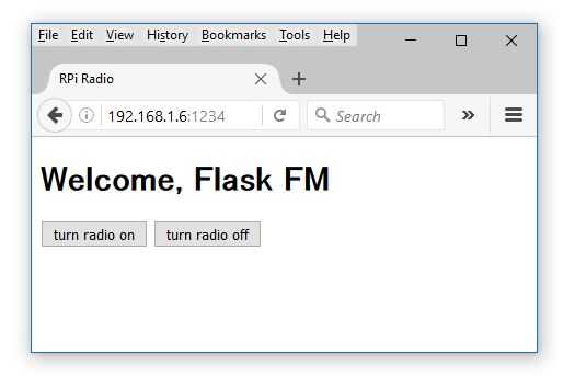 <!doctype html> <head> <title>RPi Radio</title> </head> <body> {% if name %} <h1>Welcome to {{ name }}</h1> {% else %} <h1>Welcome to RPi Radio</h1> {% endif %} <form role="form" method='POST' action='/'> <input type="submit" name="submit" value="turn radio on" /> <input type="submit" name="submit" value="turn radio off" /> </form> </body> Se trata de un archivo html simple con dos botones y una variable.
