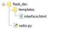 from flask import Flask from flask import render_template from flask import request import subprocess app = Flask(__name__) methods=['GET', 'POST']) def hello_world(name='Flask FM'): if request.method == 'POST': if request.form['submit'] == 'turn radio on': cmd=['mpc', 'play'] p = subprocess.Popen(cmd, stdout=subprocess.PIPE, stderr=subprocess.PIPE, stdin=subprocess.PIPE) elif request.form['submit'] == 'turn radio off': cmd=['mpc', 'stop'] p = subprocess.Popen(cmd, stdout=subprocess.PIPE, stderr=subprocess.PIPE, stdin=subprocess.PIPE) return render_template('interface.html', name=name) if __name__ == '__main__': app.run(host='0.0.0.0', port=1234, debug=True) Primero hacer las importaciones necesarias para los procesos que vamos a necesitar. A continuación definimos una función con un parámetro llamado name. Instancias de esta variable con la cadena 'Frasco FM'. En la plantilla HTML de Jinja2, se llenará la variable {{nombre}} con esta cadena. Esto es sólo para usar como ejemplo para más adelante. Se llama a la función de hello_world() una vez que se ejecuta este código python. Si se está haciendo una solicitud POST, tenemos que enviar un comando de la CLI.