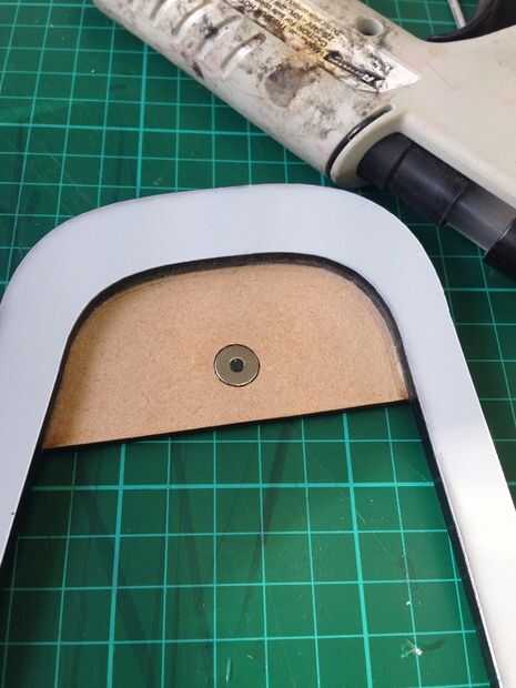 Ahora que tenemos todos los componentes necesarios podemos empezar a construir. En primer lugar la cubierta de imán y pégalo en el panel de acrílico lateral usando un adhesivo fuerte, el resultado debe ser como se ve abajo. Después de eso tomar las piezas recién construidas y los paneles laterales MDF y colocar los imanes en los agujeros que se ve abajo. Pegamento de estos imanes en el uso de la pistola de pegamento, asegurándose de que los imanes están en lo correcto, queremos que los imanes se atraen a uno otro no rechazar!