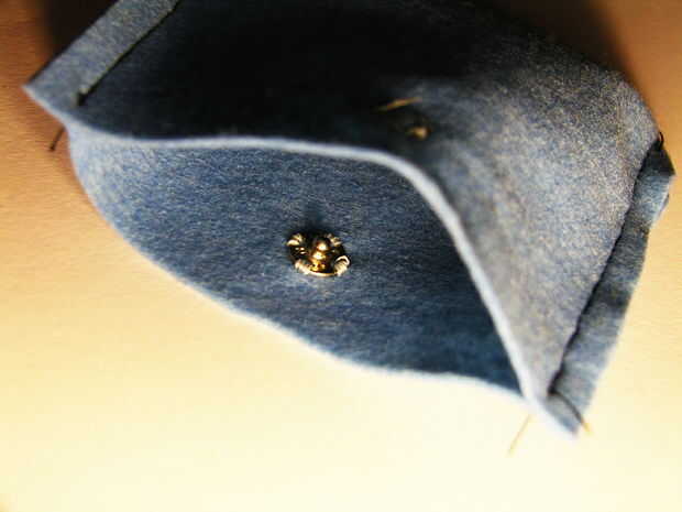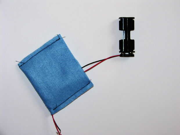 Con la tela de fieltro segunda medida alrededor de su célula de la batería y el circuito por separado. Doble a la tela por lo que recorre la pieza y coser los lados esquivando cualquier alambres protuberantes. Una vez que lo hayas hecho coser los broches en su lugar en el centro de la parte delantera de los escalfados dejando una separación de 2 cm entre la parte superior y el sujetador para las costuras.