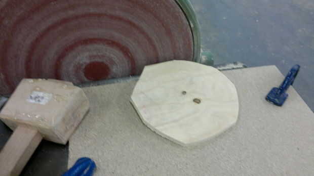 -Utiliza un mazo para golpear poco a poco la madera en el papel de lija al detener a intervalos para girar el círculo. Este proceso que he mostrado en uno de mis cuadros.