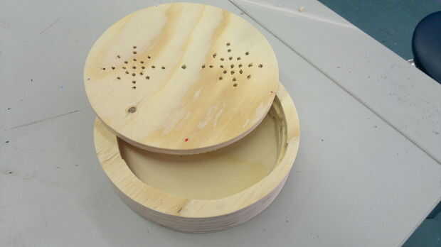 En cada conjunto de círculos, dos tienen que permanecer entero pero el resto son para ser ahuecado. Esto puede hacerse marcando un anillo de 15mm de los bordes de los círculos, perforando un agujero de 9 mm y usando una sierra de calar para recortar el círculo.