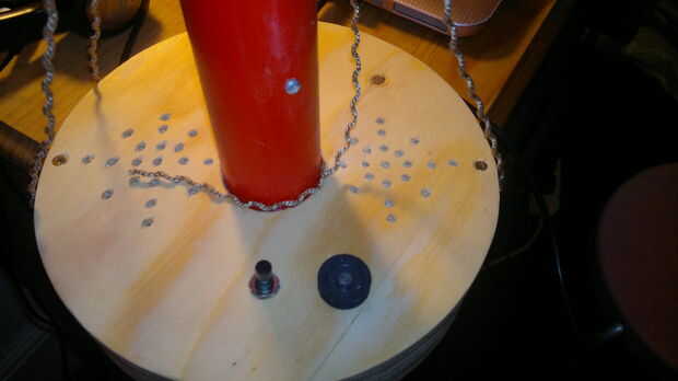 -Taladre un agujero en la parte superior de la base y en el círculo de la parte inferior de la parte superior de la radio. Los círculos debe ser ser sólo ligeramente más grande que 40mm para que una fricción de ajuste. Hice un agujero demasiado grande durante la perforación, así que había que reforzar el tubo agregando un centro de madera y perforación de juntos.