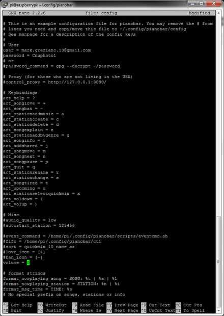 Busque las siguientes líneas en el texto que acabamos de copiar en la ventana de edición GNU nano. Cambiar el texto a su respectivo correo electrónico y contraseña que utilizas para tu cuenta de Pandora Radio gratis.