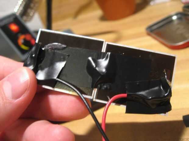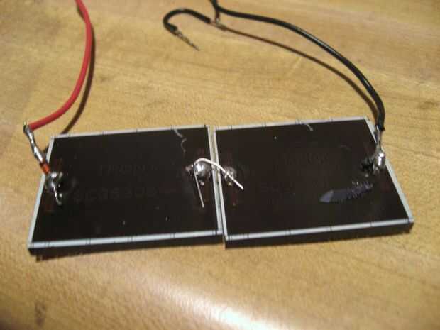 Estas células son grandes para la carga de una sola batería AAA de 1,2 voltios, pero ahora estamos utilizando dos pilas AAA en una serie para un total de 2,4 voltios. Ya que el objetivo de esto es ser una radio de emergencia y poder cargar incluso con mal tiempo debemos aumentar el voltaje en las células solares. (O puede utilizar una célula solar o grupo de células que sacó más de 4 voltios que tienes alrededor).