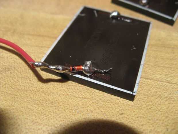 En primer lugar, soldar un alambre largo en el extremo del diodo con la tira negra. Luego suelde el otro extremo del diodo a la pestaña positivo de una de sus células solares.