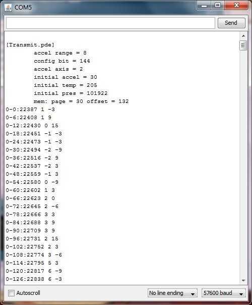 "w" - (como en "write") inicia o detiene la transmisión y grabación de datos. El LED del transmisor se iluminará durante la grabación y un mensaje que indica estado aparece en la serie. Receptor y el proceso mostrarán un flujo de salida de datos en la serie y procesamiento comenzará a graficar los datos. Vuelva a pulsar "w" para detener el flujo de datos o sólo seguir recogiendo hasta que la memoria está llena (~ 2100 lecturas o unos 42 segundos).