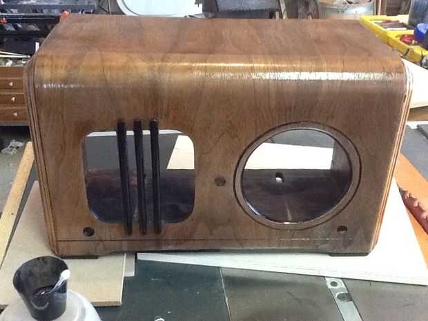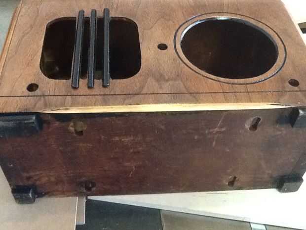 Lijar el exterior todo con lija de grano 220 a madera desnuda. Entonces había rociado el exterior con base de agua "Polycrylic" revestimiento de madera. 2 capas de luz medio lijar con grano 400. Después de eso, poco de pintura negra y un q-Tip que me ha tocado hasta los puntos negros que debían retocarse. Estoy realmente muy contento con los resultados. Me gusta el look de la madera sin la mancha oscura que habían en él...