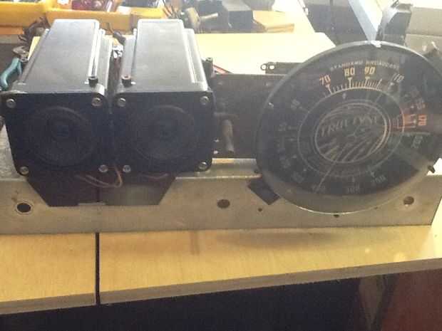 Después de quitar los altavoces les conectarse juntas y montado sobre un tablero de madera contrachapada de 3/4" y luego montados en el junta a la bandeja de radio posicionamiento de los altavoces al frente de la parrilla de radio. Esto tomó varias veces de quitar y reposicionar hasta que llegué apenas a la derecha.