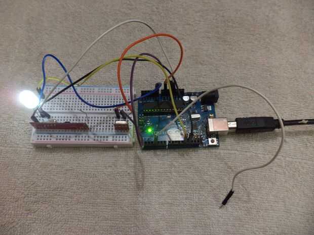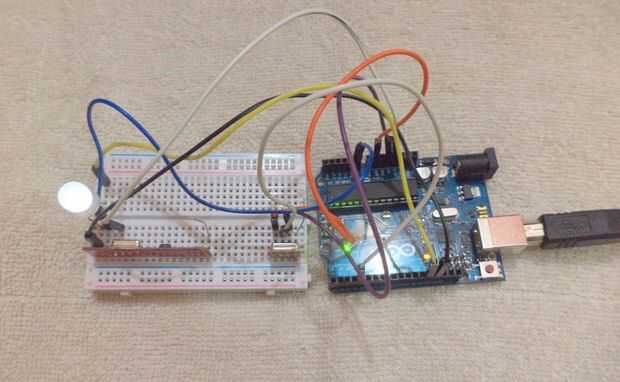 Conecte el Vcc del transmisor (tamaño pequeño) y el receptor (grande de tamaño) a + 5 voltios en el arduino y conecte los terminales negativos en el terreno de la Arduino. Observe que hay terminales de datos del transmisor como del receptor. Los datos de la terminales del emisor están donde debe dar la señal de entrada y el terminal en la tarjeta receptora de datos dará la salida. Un LED está conectado al pin 13 para controlar el brillo en función del valor de RF señal en que alimentas. Conecte el transmisor de datos para el Pin Digital 4 y receptor datos al pin analógico A0.