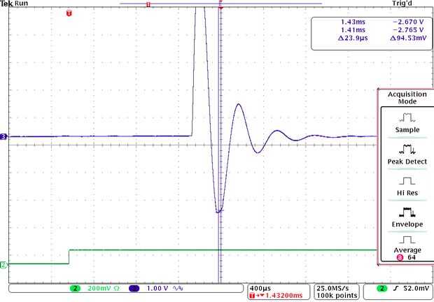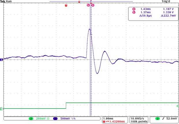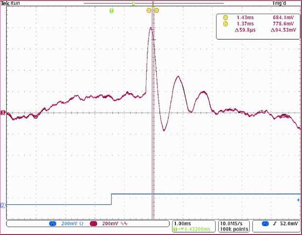 (Figura leyendas: (1) pulso resultante de una fuente de 60Co (t ~ 760ms) relación señal a ruido ~ 3:1., (2) inyección equivalente a la carga por una fuente de energía ~ 2 MeV., equivalente a (3) la inyección a la carga por una fuente de 60Co (~ 1,2 MeV))