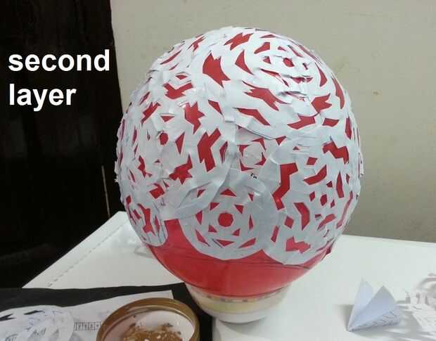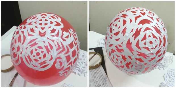 Aplique la mezcla de pegamento blanco en el copo de nieve con un pincel y lo pega en el globo. Asegúrese de que todos los copos de nieve cruzan uno con el otro mientras se pega.