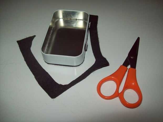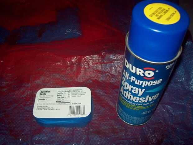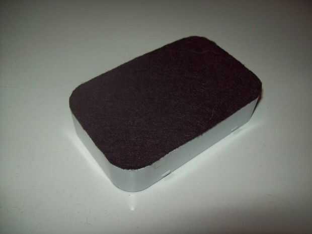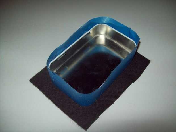 Envuelve los lados con cinta de enmascarar para evitar cualquier exceso de rociado y rocía la parte inferior de la base con adhesivo en aerosol. Luego había presionado sobre un trozo de fieltro negro y dejar secar. Después de recortar el exceso de fieltro alrededor del borde, se terminó la base.