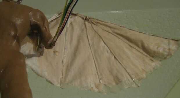 Pretende construir las alas de plumas reales (ganso?), pero por alguna razón no existían así que fue con el aspecto de ala de murciélago resistido en su lugar.