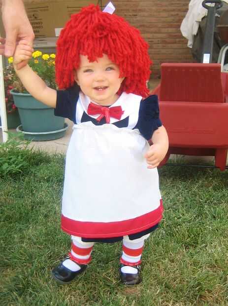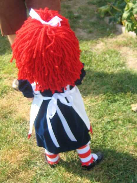 Raggedy Ann Costume. hecho de material de cuadros rojo y blanco para el vestido y los pantalones y delantal de material blanco. Material blanco un poco más fuerte del sombrero con el pelo de hilo rojo añadido. Ella tenía calcetines de rayas rojas y