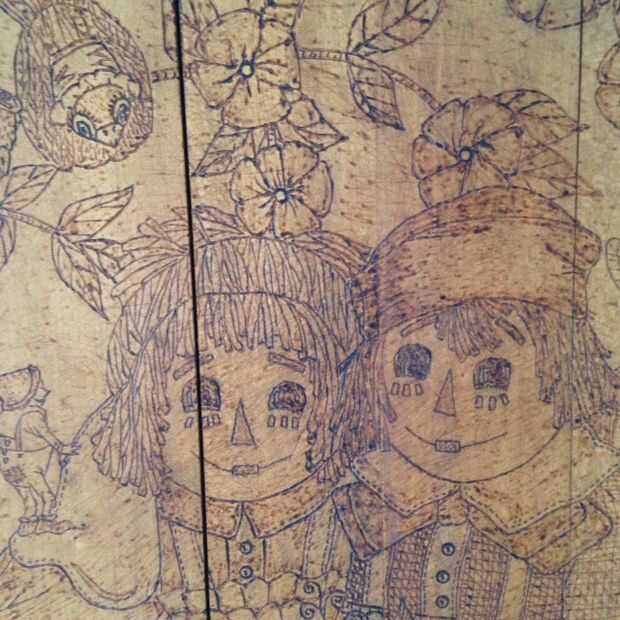 Cinta de imagen sobre el tablero de pan y traza con punzón de carpintero. Para el trabajo fino, se puede utilizar un cuchillo X-acto teniendo cuidado de no cortar tanto de su papel que la imagen cambia. Las líneas con sangría resultantes en forma de madera natural de leña las líneas de trazo de herramienta. Inspección cercana de Raggedy Ann y Andy muestra algunas líneas de corte finas que no fueron retraced con una madera queman herramienta.