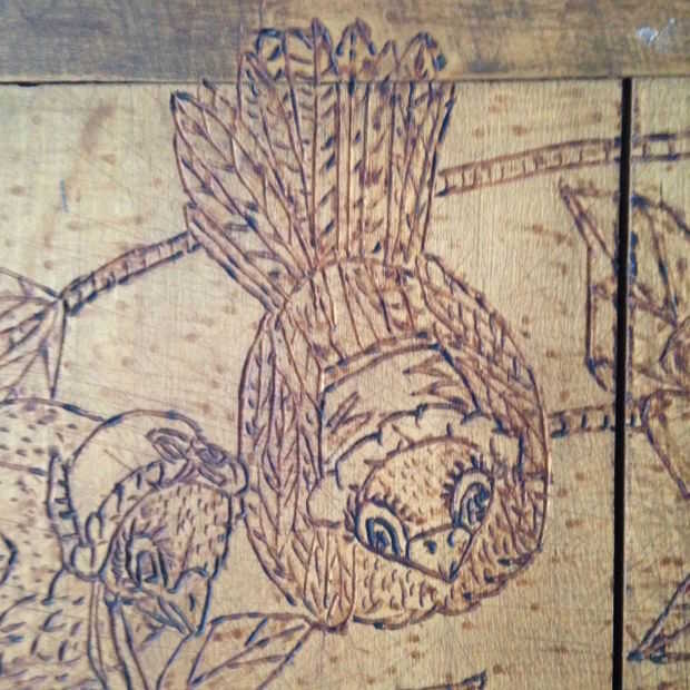 Examen minucioso de las imágenes indica varias texturas y sombreado técnicas de incubación para varios patrones de punteado y scumbling. Nota, incluso el fondo está sombreado con garabato luz madera quemaduras. También tenga en cuenta, la imagen se extiende hasta el borde superior suavizar la estructura. La Junta de pan está suspendida por una cadena simple de algodón a través del agujero, apropiado para este complicado pero simple Raggedy Ann y Andy.