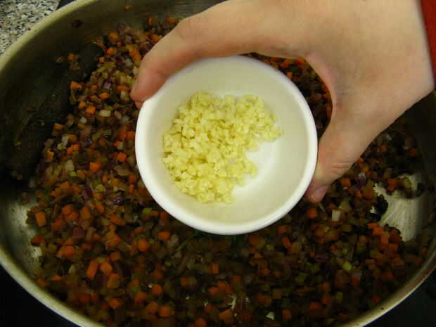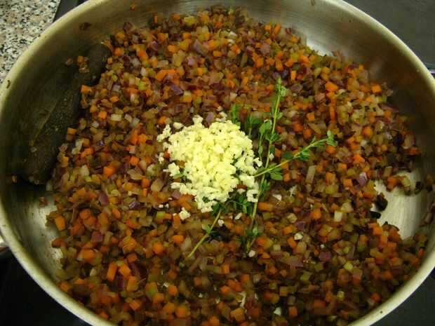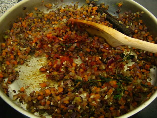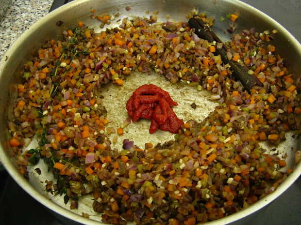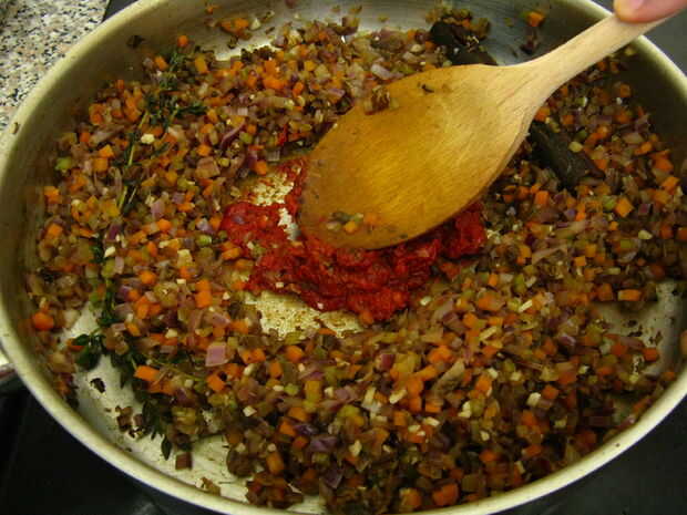 Punta en el puré de tomate (pasta) y freír durante un minuto o menos para caramelizar.
