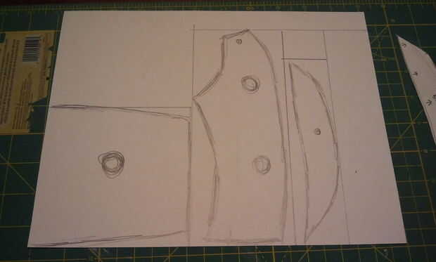 5) dentro de los pensionistas de la caja que acaba de dibujar, croquis a mano alzada la parte que estaba tratando de hacer. Estoy muy mal en el dibujo así que tomó varios intentos hasta que me sentí "eh, lo suficientemente bueno." También me aseguré de cortar los agujeros para los 200 + ojal agujeros que tendrían que rellenarse más tarde.