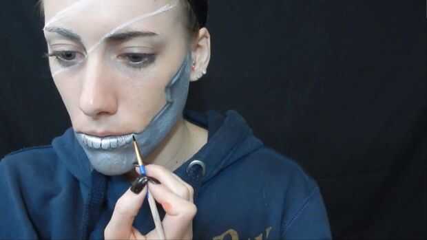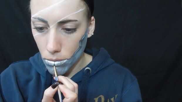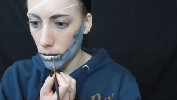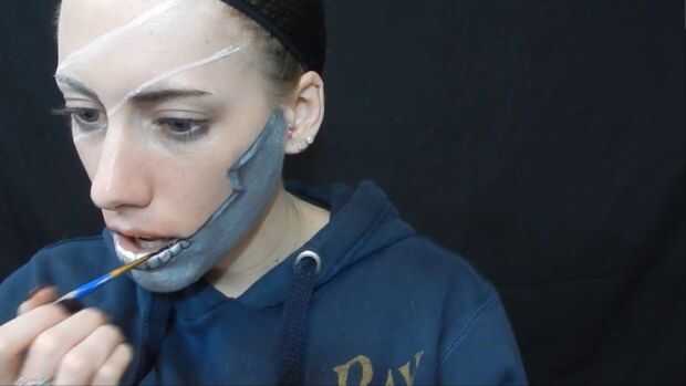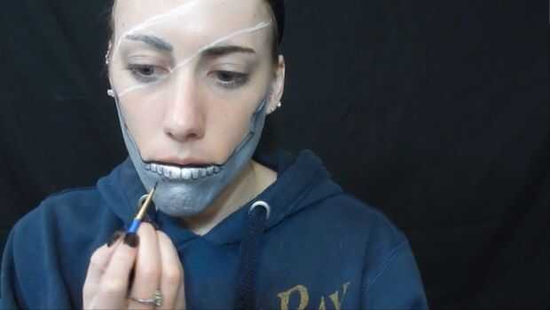 Usar sombra de ojos negro empecé los dientes, utiliza pintura de cuerpo negro para empezar a hacer detalles más agudos y fue con sombra de ojos más donde sentí que necesitaba, y último usé pintura de cuerpo blanco para resaltar los dientes y 'encías'.