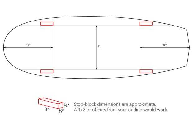 Usted querrá añadir algunos bloques de tope para mantener el tablero completamente apagado el rodillo. En mi tablero que he intentado conseguir lujo y éstos ejecutan la longitud de los bordes, que demostró ser una pérdida de tiempo y a la Junta más difícil ride.* en su lugar, sólo tiene que añadir cuatro pequeños bloques en la parte inferior. Bloques deben ser aproximadamente 3" largo y 3/4" densamente, tal vez 3/4" de ancho. Énfasis en aproximadamente. Podría utilizar 1x2s chatarra o recortes de su contorno de madera contrachapada. Consulte el diagrama y las líneas centro de dos para delimitar un rectángulo de 11" ancho y 12" de la nariz y la cola. Coloque los bloques fuera de este rectángulo, pegamento y les tornillo encima. Dependiendo del tamaño de sus bloques, puede que necesite cortarlos para evitar superposición el contorno.