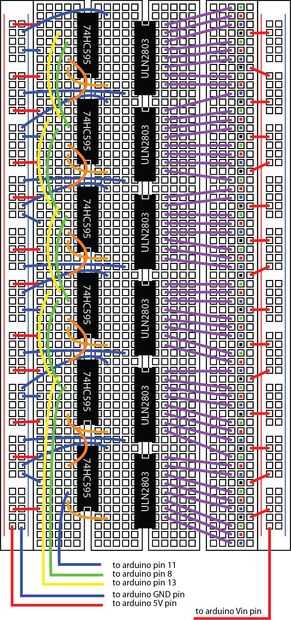 Introducción de la RainBoard: un simple fundido RGB LED arco iris utilizando un Arduino Uno y unos pocos componentes sencillos. Créalo o no, controlamos 45 canales de LEDs RGB en 32 niveles de brillo con sólo 3 pines digitales del Arduino! ¿Cómo es posible que pregunte? Mediante el uso de dos conceptos de magia: cambio de registros y modulación por ancho de pulso. Algunas de las imágenes de esquemas pueden parecer desalentador, pero si todas las instrucciones se sigan cuidadosamente, debe ser fácil tener este juego ya en funcionamiento en menos de 30 minutos (ideal para aquellos que olvidaron para que especial alguien una Navidad presentes este año!).