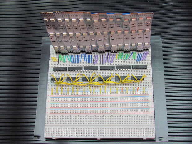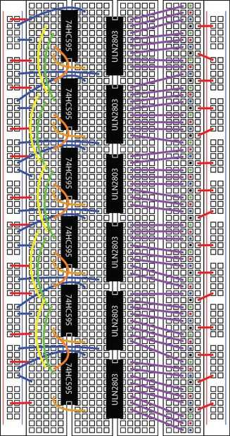 Ahora el otro paso es hacerlo sencillo y fácil de estropear. Vamos a conectar el pin 12 del registro izquierdo en pin 12 del registro de su derecho. Hará esto con todo el cambio de registros. Somos piggy-backing señal en un sentido raro. Hacer lo mismo con todo pin 11 de los registros. Si te pierdes, ver las imágenes.