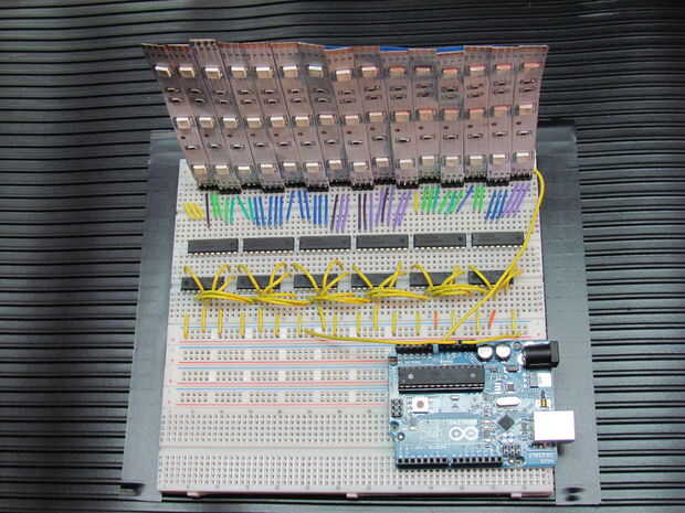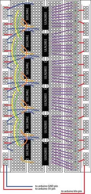 Ahora para algo de poder. Conectar el carril de alimentación positiva que el RGB LED están conectado al pin 'Vin' de Arduino. Desde que se alimentar el Arduino con un + fuente de alimentación 12VDC, esto nos dará acceso a los + 12VDC del perno de la Arduino 'Vin'. Después de eso, conecte el otro larguero de energía positiva al pin '5V' de Arduino y su carril adyacente poder negativo al pin 'GND' de Arduino. Ver imágenes.