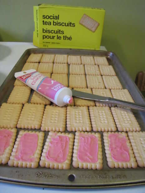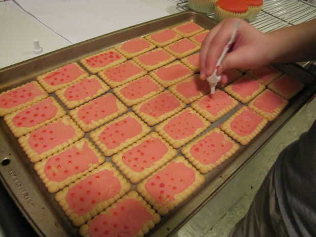 consideré hacer galletas de mantequilla para representar el entero Nyan Cat, pero que habría requerido un montón de corte más incómoda. Cuando vi estas galletas de té sociales en la tienda de comestibles, sabía que sería perfectos. Yo les helado con glaseado rosa, y luego aplicamos pequeñas rojo glaseado puntos como cuerpo pop tart de Nyan Cat.