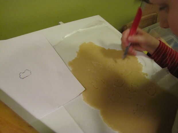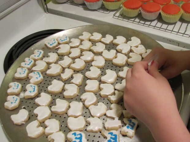 hice cabeza de Nyan Cat de masa para galletas de mantequilla. Utiliza un cortador de corazón pequeño y sólo cogió algunos bordes para alcanzar una forma aceptable. Mi hijo quería su mirar más pixelada, así que corte un buen número a mano. Cuando las galletas estaban frescas, los helados con glaseado blanco delgado, dejó glaseado azul seco, luego usado para funciones.