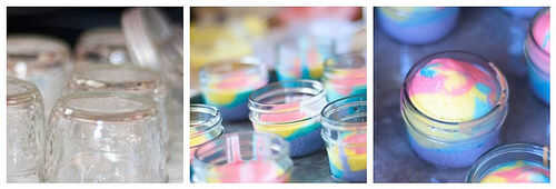 Añadir aproximadamente 1 cucharadita de cada color en los frascos para conservas. Coloque los frascos para conservas en una hoja de cocción con sobre 1/4 de agua en él. Hornear en el horno a 350f por 25-30 minutos.