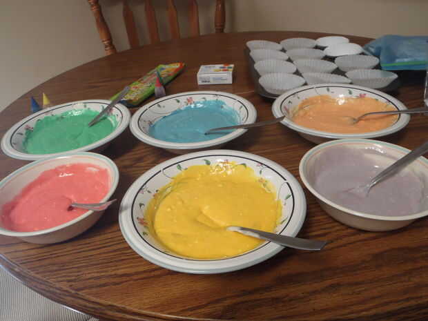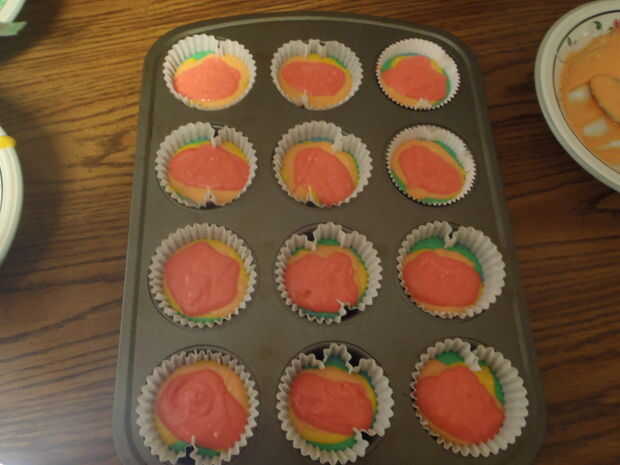 Para cupcakes-tome una cuchara llena de cada color y capa en el papel de la Magdalena. Si los haces en orden VBGYOR