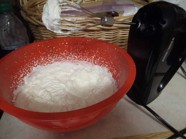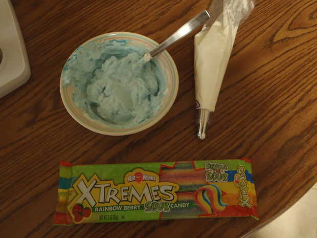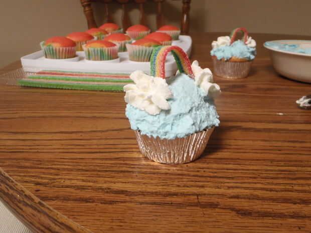 Cupcakes - después de los cupcakes al horno y refrigerado por hacer el glaseado. Mezclar la crema de leche con una batidora hasta que espese, entonces mezcla en polvo de azúcar para darle una textura más gruesa y que sea dulce. Entonces la mitad color azul para ver el cielo, y la otra mitad deja blanco para las nubes. Cada cupcake con el azul de la capa, luego corte cada airhead extrema a la mitad y colocar en la parte superior en forma de un arco iris, y poner glaseado blanco en los bordes para ayudar a mantener en su lugar y mirar como las nubes.